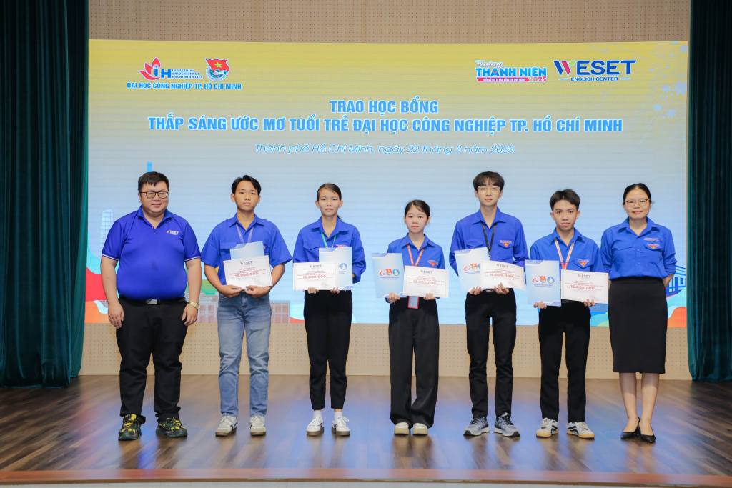 Đại diện Công ty TNHH WESET English Center và đai diện Nhà trường trao 5 suất học bổng “Thắp sáng ước mơ Tuổi trẻ Công nghiệp năm 2025” đến các Cán bộ Đoàn - Hội có thành tích tốt trong học tập