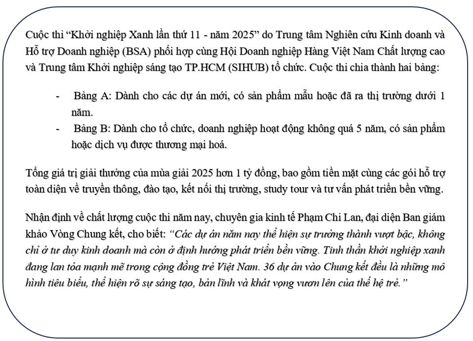 Bước lên sân khấu vòng Chung kết Khởi nghiệp Xanh 2025, Khang - Trân - Phúc không chỉ mang đến những con số và bản kế hoạch chỉn chu, mà còn mang theo niềm tin vào giá trị của gừng Việt, khát vọng kiến tạo sinh kế bền vững cho người nông dân, và niềm tự hào khẳng định sinh viên Việt Nam hoàn toàn có thể làm chủ những dự án khởi nghiệp xanh, mang ý nghĩa xã hội và thân thiện môi trường.