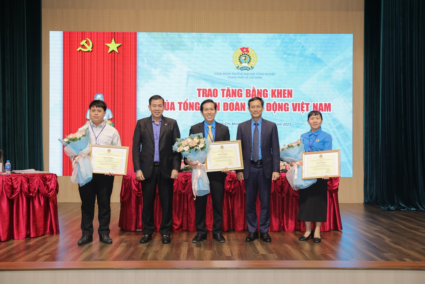 Tại Đại hội, đồng chí Lê An Hải và TS. Phan Hồng Hải – đại diện Ban Chấp hành Tổng Liên đoàn Lao động Việt Nam đã trao Bằng khen cho các cá nhân: đồng chí Lê Ngọc Sơn – Chủ tịch Công đoàn Trường, Viện trưởng Viện Đào tạo Quốc tế & Sau đại học (đứng giữa); đồng chí Trần Huế Chi – Ủy viên Ban Chấp hành Công đoàn Trường, Phó Trưởng phòng Đào tạo; và đồng chí Lê Văn Hoàng – Bí thư Đoàn Thanh niên Trường (ngoài cùng bên trái) có thành tích xuất sắc trong phong trào thi đua lao động giỏi và xây dựng tổ chức Công đoàn vững mạnh năm học 2024-2025