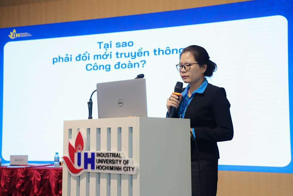 Đồng chí Nguyễn Thị Thương – Uỷ viên Ban Chấp hành Công đoàn trường, Giám đốc Trung tâm Thông tin – Truyền thông trình bày tham luận tại đại hội