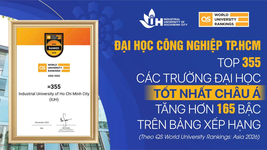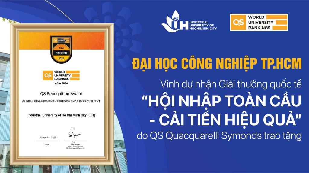Đại học Công nghiệp TP. Hồ Chí Minh (IUH) vinh dự nhận Giải thưởng quốc tế “Global Engagement - Performance Improvement” (Hội nhập toàn cầu - Cải tiến hiệu quả) do QS Quacquarelli Symonds trao tặng. Cũng trong dịp này, QS World University Rankings: Asia 2026 công bố IUH tiếp tục được thăng hạng với vị trí 355 trong bảng xếp hạng giáo dục đại học khu vực Châu Á và 73 tại khu vực Đông Nam Á.