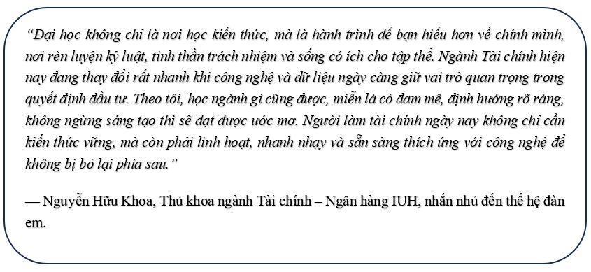 Discussing his study habits, Khoa said: “Throughout my three years at IUH, I’ve followed the principle ‘learn thoroughly, master deeply’ — not rushing to pass but striving to truly understand and relate theory to real finance and investment practices. I also follow my own ‘three-no rule’: No procrastination – No superficial studying – No stopping self-improvement.”