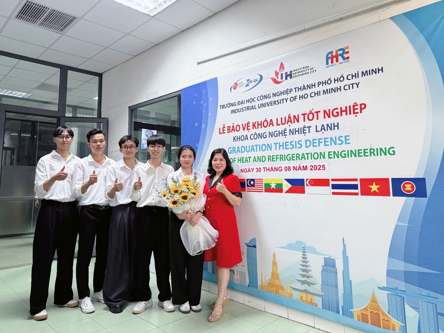 TS. Nguyễn Thị Thanh Tâm - Trưởng khoa Công nghệ Nhiệt Lạnh (đầu tiên bên phải) và sinh viên Phạm Thanh Phú (thứ hai bên trái qua) cùng các bạn tại buổi bảo vệ khoá luận