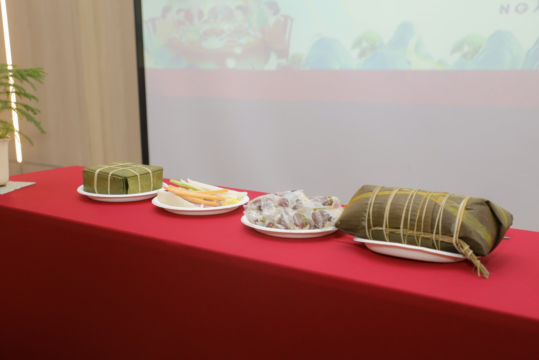 Tiếp nối câu chuyện ấy, thầy Trịnh Ngọc Nam - Trưởng phòng Quản lý Khoa học & Hợp tác Quốc tế đã minh họa nét đẹp bánh chưng, bánh tét qua màn hướng dẫn cắt bánh Chưng bằng dây lạt theo phong cách miền Bắc. Những lát bánh vuông vức, đẹp mắt trong tiếng vỗ tay hào hứng của sinh viên đã biến kỹ thuật dân gian thành một bài học văn hóa sống động ngay trên sân khấu.