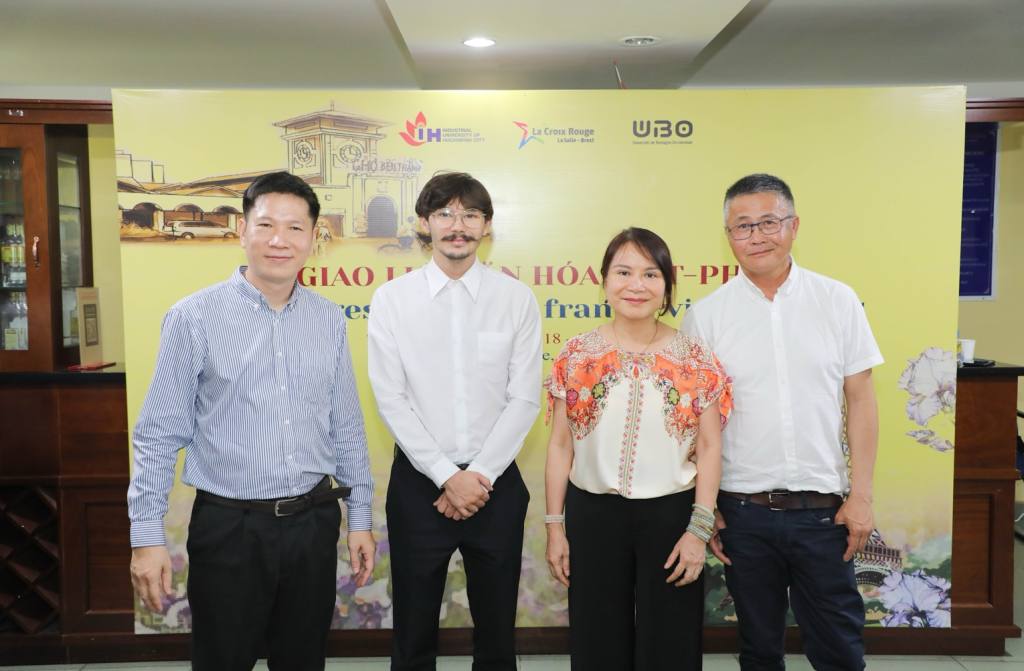 PGS. TS. Đàm Sao Mai –Phó Hiệu trưởng nhà trường, Ông Andrea Taglioni, đại diện Tồng Lãnh sự Pháp tại TP. Hồ Chí Minh (đứng giữa), PGS. TS. Trịnh Ngọc Nam – Trưởng phòng QLKH&HTQT, ông Claude Vo – giảng viên UBO