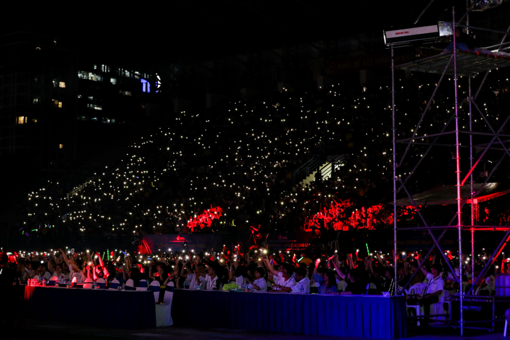 Khi màn đêm buông xuống, sân vận động bừng sáng với Chương trình chào mừng Tân sinh viên. Không khí trang trọng mở đầu bằng phần phát biểu của Hiệu trưởng, vinh danh những gương mặt thủ khoa xuất sắc và tri ân các đơn vị đồng hành cùng nhà trường. Ngay sau đó, cả sân khấu sẽ thực sự bùng nổ trong đại nhạc hội với loạt nghệ sĩ đình đám: JSOL, Anh Tú, Thanh Duy, Trọng Hiếu, cùng sự xuất hiện của DJ Zan & Mike và dàn khách mời trẻ trung, mang đến một đêm đáng nhớ cho hàng chục ngàn khán giả.