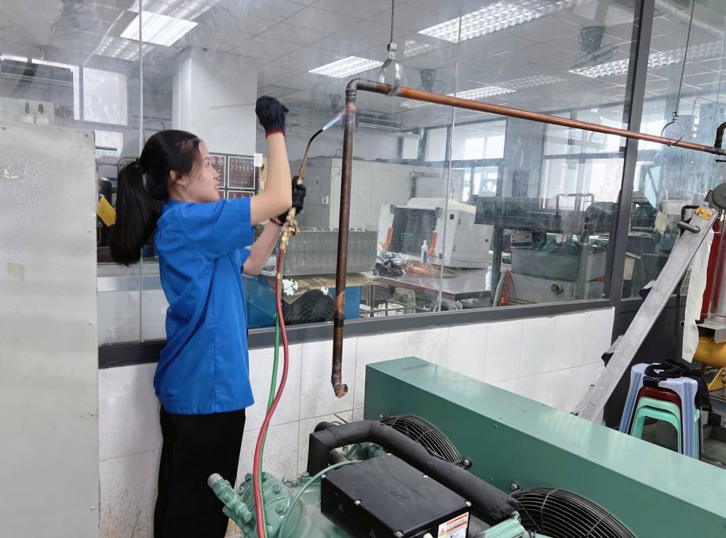 Ý Hậu đang thực hành hàn ống đồng của kho lạnh tại phòng thực hành khoa Công nghệ Nhiệt Lạnh