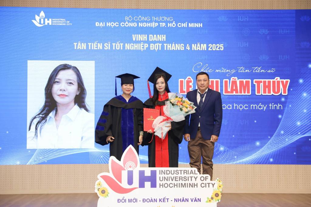 Đặc biệt, chị Lê Nhị Lãm Thúy - tân Tiến sĩ ngành Khoa học máy tính, chia sẻ: Tôi rất vinh dự khi trở thành một trong những gương mặt mở đầu cho bậc tiến sĩ của IUH trong lĩnh vực này. Hành trình nghiên cứu không chỉ toàn công thức và mô hình, mà còn có cả những lần bản thảo bị từ chối, tiến độ chậm trễ và những khoảnh khắc hoài nghi chính mình. Điều giúp tôi đi đến cùng là kỷ luật mỗi ngày, sự động viên từ gia đình, thầy hướng dẫn và môi trường học thuật tại IUH. Tôi nhận ra rằng thất bại cũng là dữ liệu, và dữ liệu sẽ biết nói nếu ta đủ kiên nhẫn. Tôi muốn nhắn nhủ: hãy bền bỉ hơn nỗi sợ, trung thực hơn kỳ vọng và luôn giữ niềm say mê khám phá.”