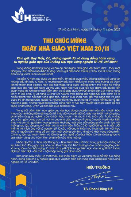Thư chúc mừng Ngày Nhà giáo Việt Nam 20/11 của Bí thư Đảng ủy, Hiệu trưởng Nhà trường