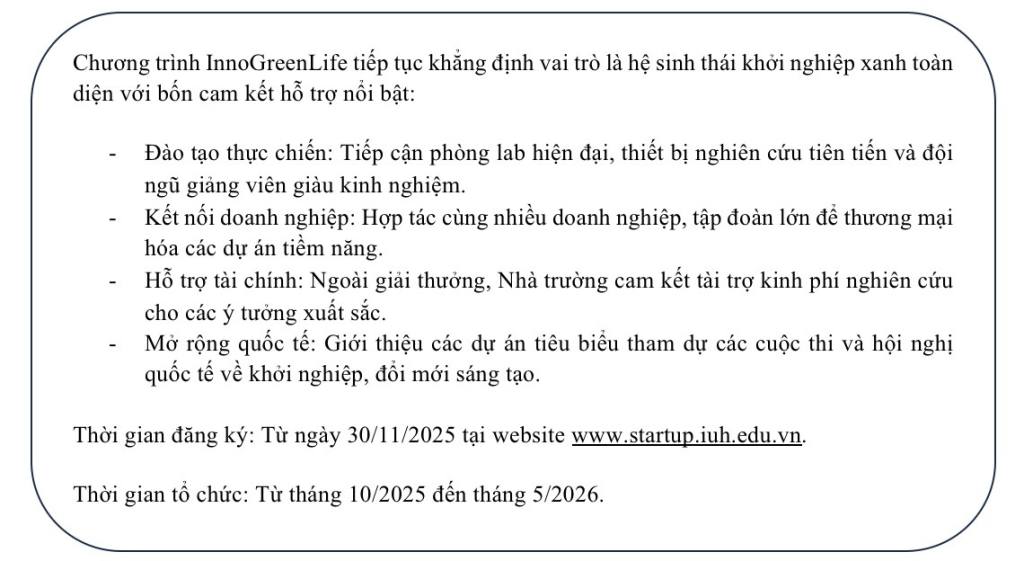 Ngay sau phần chia sẻ của đại diện doanh nghiệp, Ban Tổ chức chính thức phát động InnoGreenLife lần 5 với chủ đề “Vì Cuộc Sống Xanh”, kêu gọi sinh viên toàn trường đóng góp những ý tưởng đổi mới sáng tạo, hướng đến giải quyết các vấn đề môi trường và phát triển bền vững.
