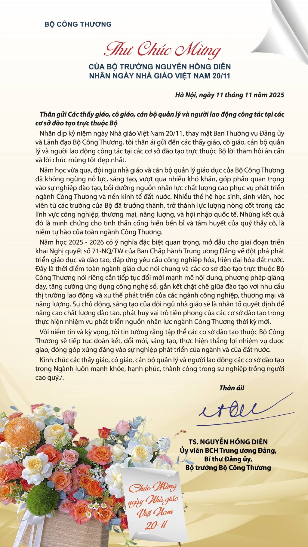 Thư chúc mừng của Bộ trưởng Nguyễn Hồng Diên nhân Ngày Nhà giáo Việt Nam 20/11