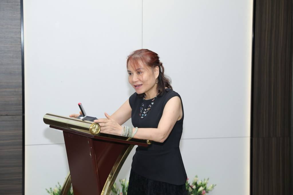 Bà Phó Hải Chi - Giám Đốc, đại diện Q Systems trao trao bảng xác nhận tài trợ cho PGS. TS. Đàm Sao Mai, Phó Hiệu trưởng IUH