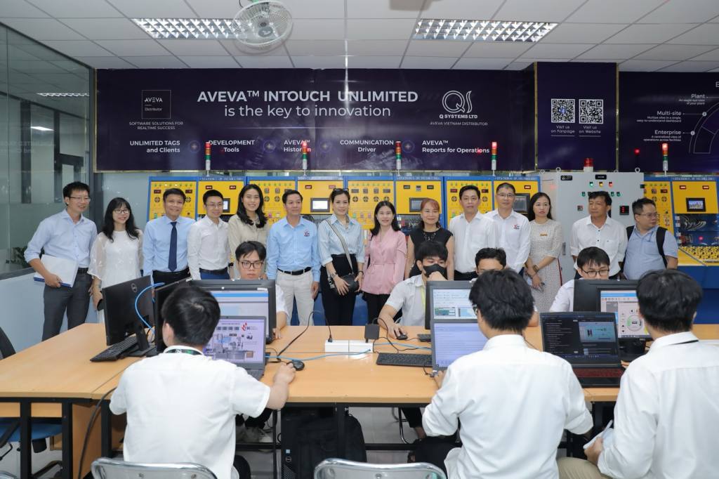 Buổi lễ tiếp nhận diễn ra trang trọng với sự tham dự của lãnh đạo nhà trường gồm PGS.TS Đàm Sao Mai – Phó Hiệu trưởng, TS. Trần Thanh Ngọc – Trưởng Khoa Công nghệ Điện, PGS.TS Trịnh Ngọc Nam – Trưởng phòng Quản lý Khoa học và Hợp tác Quốc tế, cùng đại diện các phòng, khoa, trung tâm và đông đảo sinh viên ngành Công nghệ Điện. Đại diện phía nhà tài trợ có bà Nguyễn Thị Minh Trâm – Quản lý vùng AVEVA tại Việt Nam, bà Phó Hải Chi – Giám đốc Công ty Q Systems, cùng các chuyên gia đến từ Công ty Q Systems – đối tác triển khai của AVEVA.