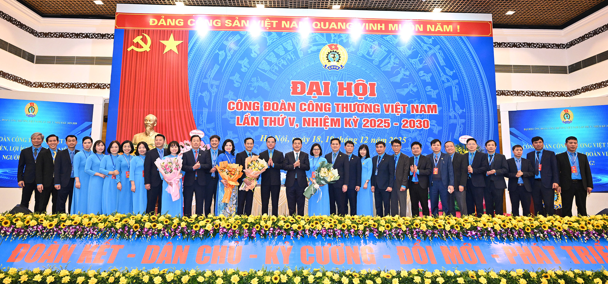 Đồng chí Nguyễn Đình Khang - Ủy viên BCH Trung ương Đảng, Phó Chủ tịch Mặt trận Tổ quốc Việt Nam, Bí thư Đảng đoàn, Chủ tịch Tổng Liên đoàn Lao động Việt Nam; đồng chí Nguyễn Hồng Diên - Ủy viên BCH Trung ương Đảng, Bí thư Ban Cán sự đảng, Bộ trưởng Bộ Công Thương tặng hoa cho Ban Chấp hành Công đoàn Công Thương Việt Nam khoá V, nhiệm kỳ 2025 - 2030