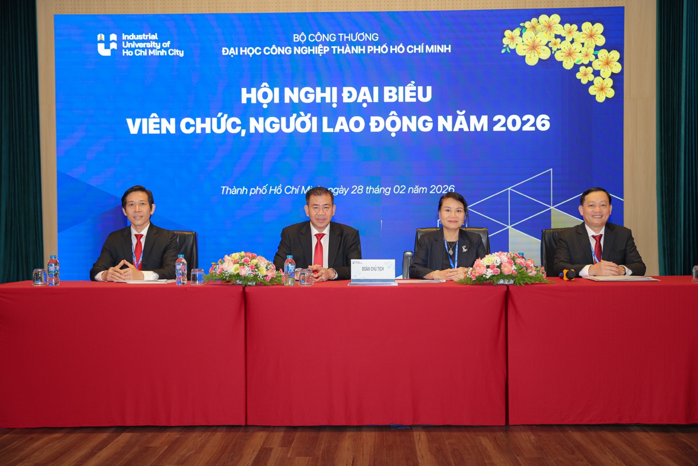 Đoàn chủ tich gồm PGS.TS Phan Hồng Hải - Bí thư Đảng ủy, Hiệu trưởng nhà trường; PGS.TS Đàm Sao Mai và TS Nguyễn Xuân Hồng - Phó Hiệu trưởng (bìa phải) và TS. Lê Ngọc Sơn - Ủy viên Ban Thường vụ Công đoàn Công Thương Việt Nam, Viện trưởng viện ĐTQT và SĐH (bìa trái)