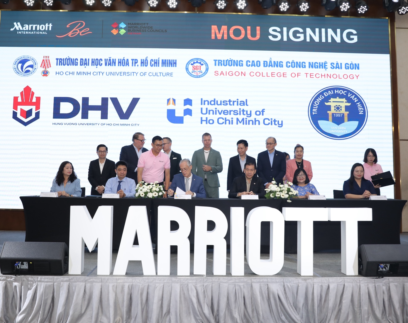 Sáng 6/4, tại TP.HCM, Tập đoàn Marriott International tổ chức lễ ký kết hợp tác với 12 cơ sở giáo dục, trong đó có Trường đại học Công nghiệp TP. HCM (IUH), nhằm phát triển nguồn nhân lực chất lượng cao cho ngành du lịch - khách sạn.