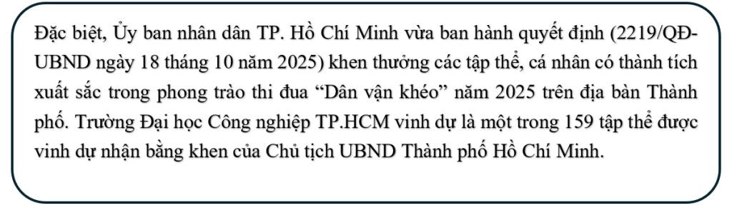 Cũng trong đợt thi đua này, nhiều tập thể và cá nhân của Trường Đại học Công nghiệp TP. Hồ Chí Minh (IUH) cũng vinh dự được Đảng ủy UBND TP. Hồ Chí Minh tuyên dương ở cấp cơ sở: