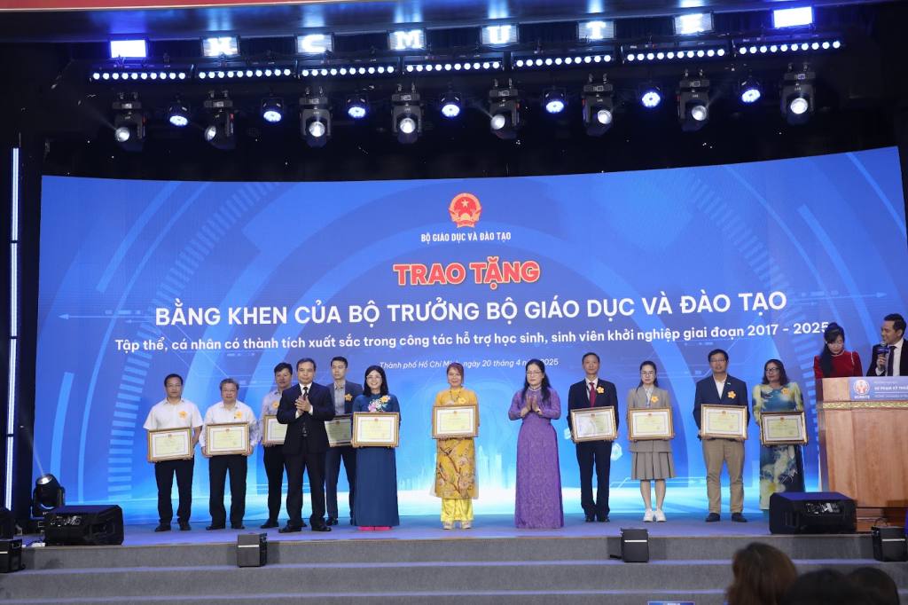 Trong khuôn khổ Ngày hội khởi nghiệp quốc gia của học sinh – sinh viên năm 2025 (SV_STARTUP VII) diễn ra vào ngày 20/4/2025 tại Trường Đại học Sư phạm Kỹ thuật TP.HCM, Trung tâm Đổi mới sáng tạo, Khởi nghiệp và Chuyển giao công nghệ – Đại học Công nghiệp TP.HCM (IUH) đã vinh dự được Bộ trưởng Bộ Giáo dục và Đào tạo trao tặng Bằng khen vì có thành tích xuất sắc trong công tác hỗ trợ học sinh – sinh viên khởi nghiệp giai đoạn 2017–2025, thuộc Đề án 1665 của Thủ tướng Chính phủ.