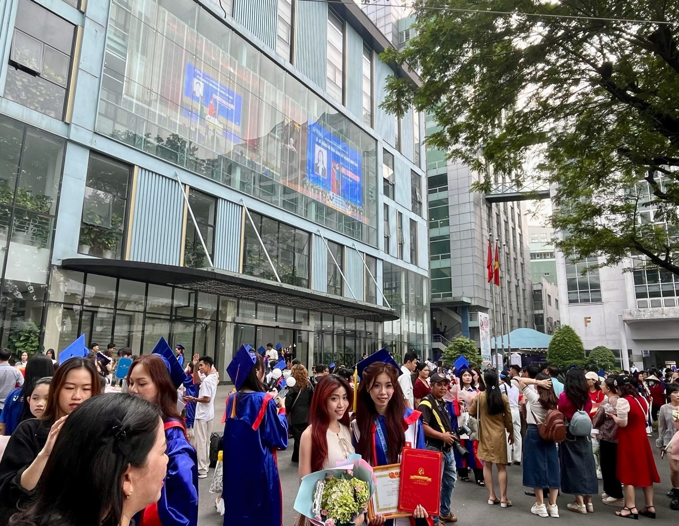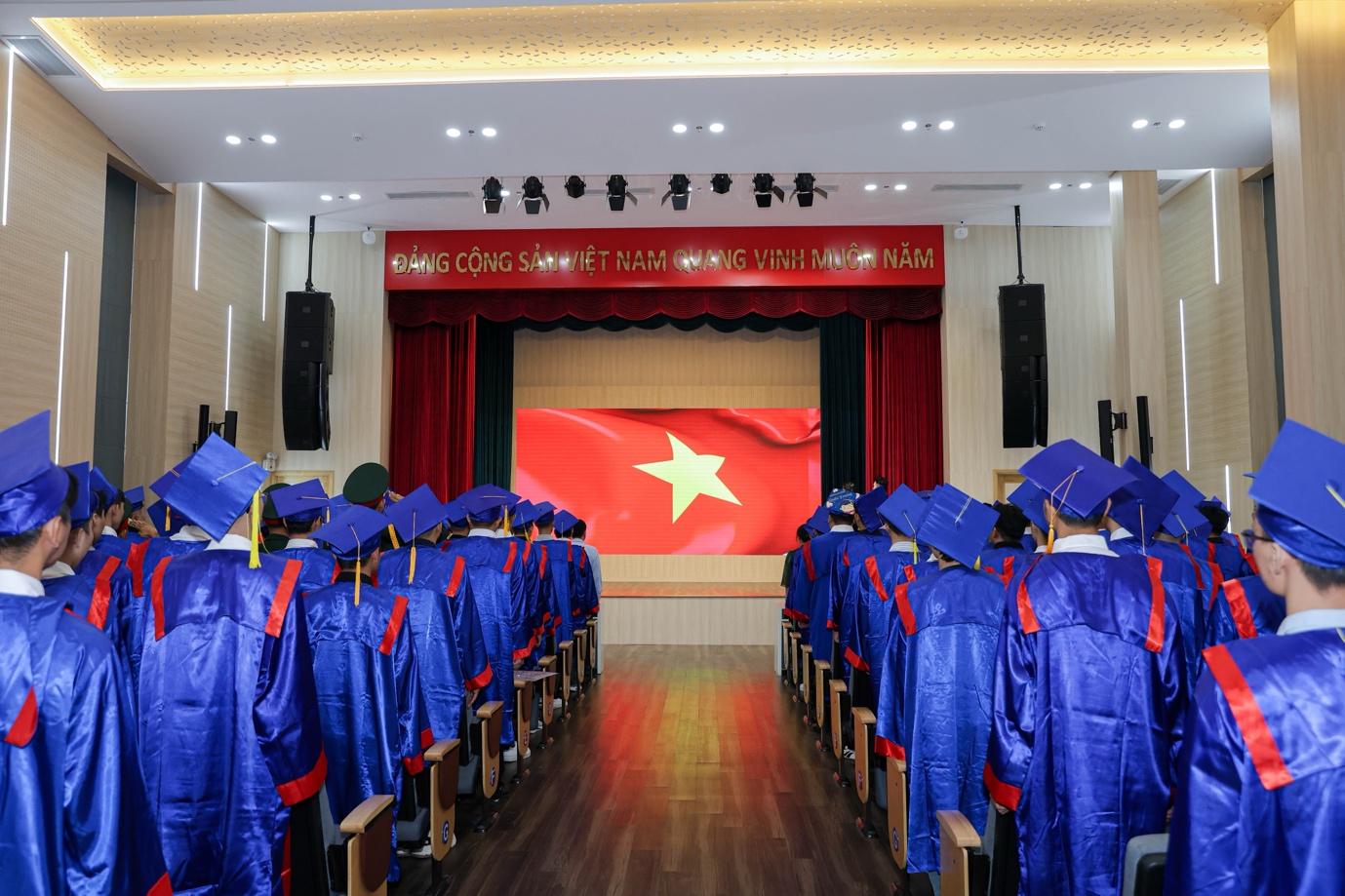 Lần đầu tiên, nhà trường livestream lễ trao bằng trên màn hình LED lớn tại nhà E, giúp phụ huynh dễ dàng theo dõi và cảm nhận trọn vẹn không khí trang trọng của buổi lễ.