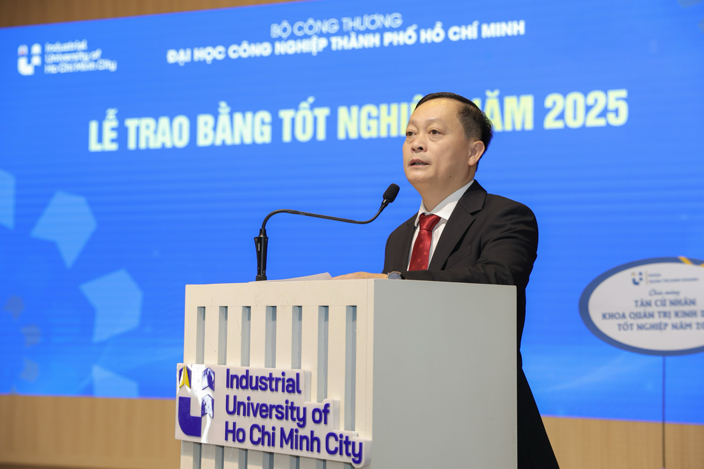 TS. Nguyễn Xuân Hồng - Phó Hiệu trưởng Nhà trường đã chúc mừng các tân cử nhân, kỹ sư đã nỗ lực vượt qua nhiều thách thức để hoàn thành chặng đường đại học. Thầy nhấn mạnh: “IUH tự hào khi nhìn thấy các em trưởng thành, tự tin và sẵn sàng bước vào hành trình mới. Mong rằng các em sẽ mang theo tinh thần Innovation - Unity - Humanity để trở thành những đại sứ trẻ của IUH, đóng góp cho cộng đồng và đất nước”.