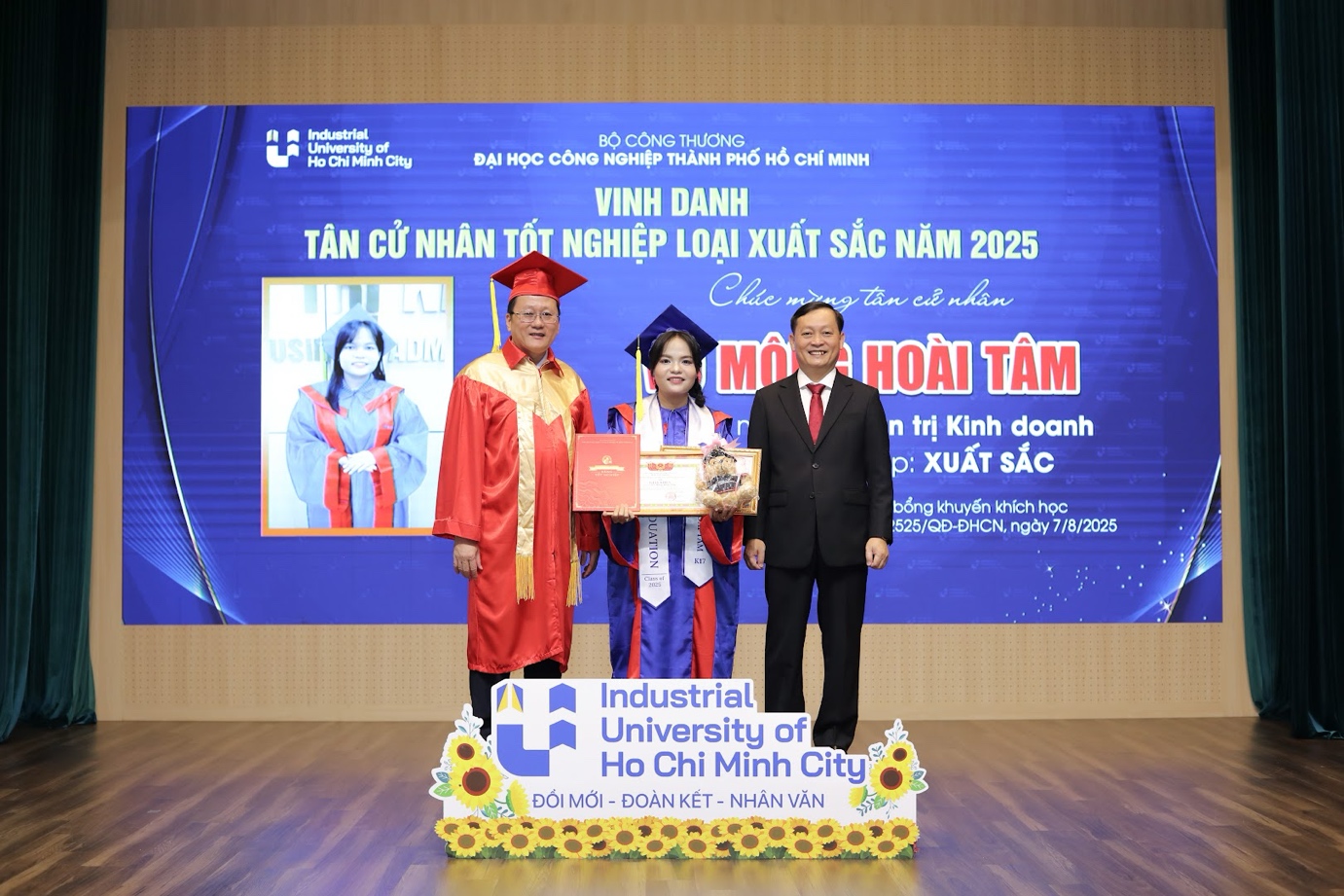 Bên cạnh Khánh Duy, mùa tốt nghiệp năm nay còn ghi dấu nhiều gương mặt ưu tú. Trịnh Vân Anh, tốt nghiệp xuất sắc ngành Ngôn ngữ Anh, gọi bốn năm đại học là “một giấc mơ đẹp” - nơi những lo âu, bỡ ngỡ ngày đầu đã nhường chỗ cho sự trưởng thành qua từng bài học, từng thách thức. Vân Anh nói rằng: “Tri thức và nhân cách vun bồi tại IUH sẽ là hành trang để cô bước vào đời, sống xứng đáng với kỳ vọng của gia đình và thầy cô”.