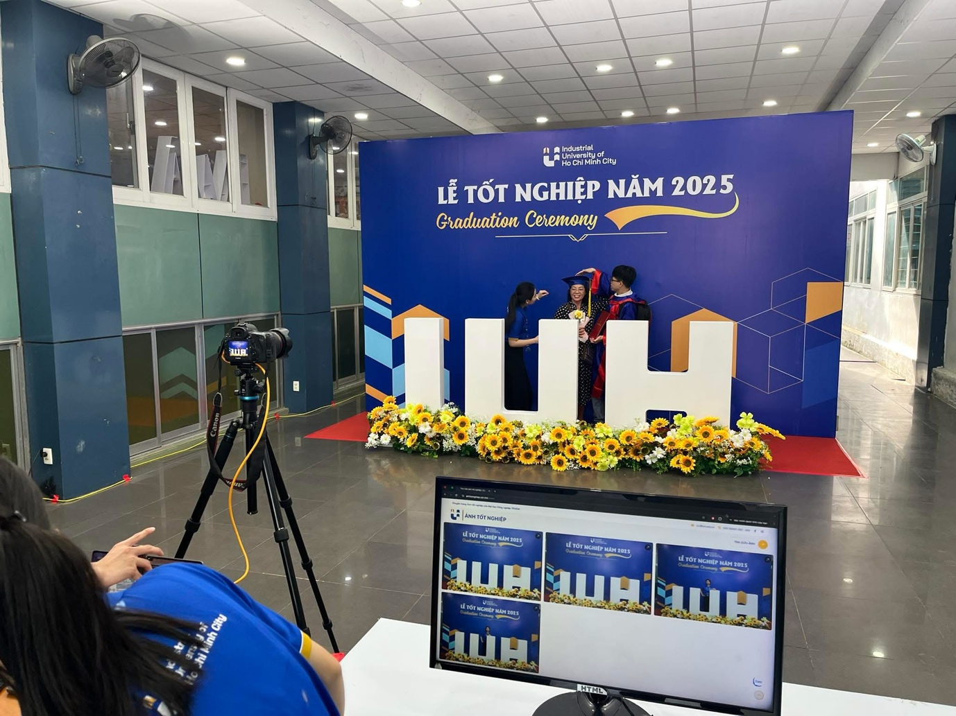 Mùa tốt nghiệp năm nay, IUH tạo nên nhiều điểm nhấn mới. “Đại lộ Vinh danh” - nơi in tên tất cả tân cử nhân, kỹ sư, trở thành địa điểm check-in yêu thích của sinh viên. Hàng loạt background được bố trí khắp khuôn viên, cùng trạm Photobooth tại Nhà văn hóa sinh viên luôn đông kín các gia đình chờ chụp ảnh.