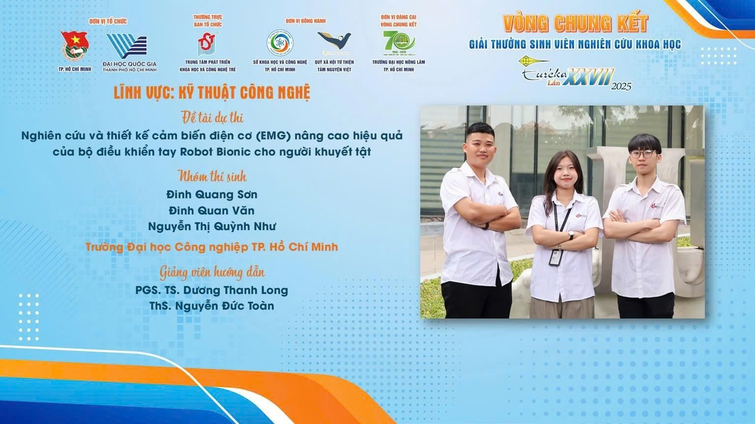 Nhóm sinh viên IUH gồm Đinh Quang Sơn, Đinh Quan Văn và Nguyễn Thị Quỳnh Như tham dự với đề tài “Nghiên cứu và thiết kế cảm biến điện cơ (EMG) nâng cao hiệu quả của bộ điều khiển tay Robot Bionic cho người khuyết tật”, dưới sự hướng dẫn của PGS.TS. Dương Thanh Long - Phó Trưởng khoa Công nghệ Điện và ThS. Nguyễn Đức Toàn - giảng viên khoa Công nghệ Điện.