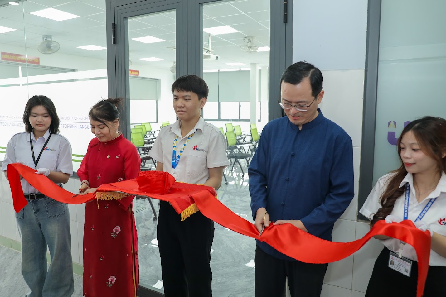Đại diện Tổng Lãnh sự quán Trung Quốc tại TP. Hồ Chí Minh và Trường Đại học Công nghiệp TP. Hồ Chí Minh (IUH) thực hiện nghi thức cắt băng khánh thành phòng học đa chức năng